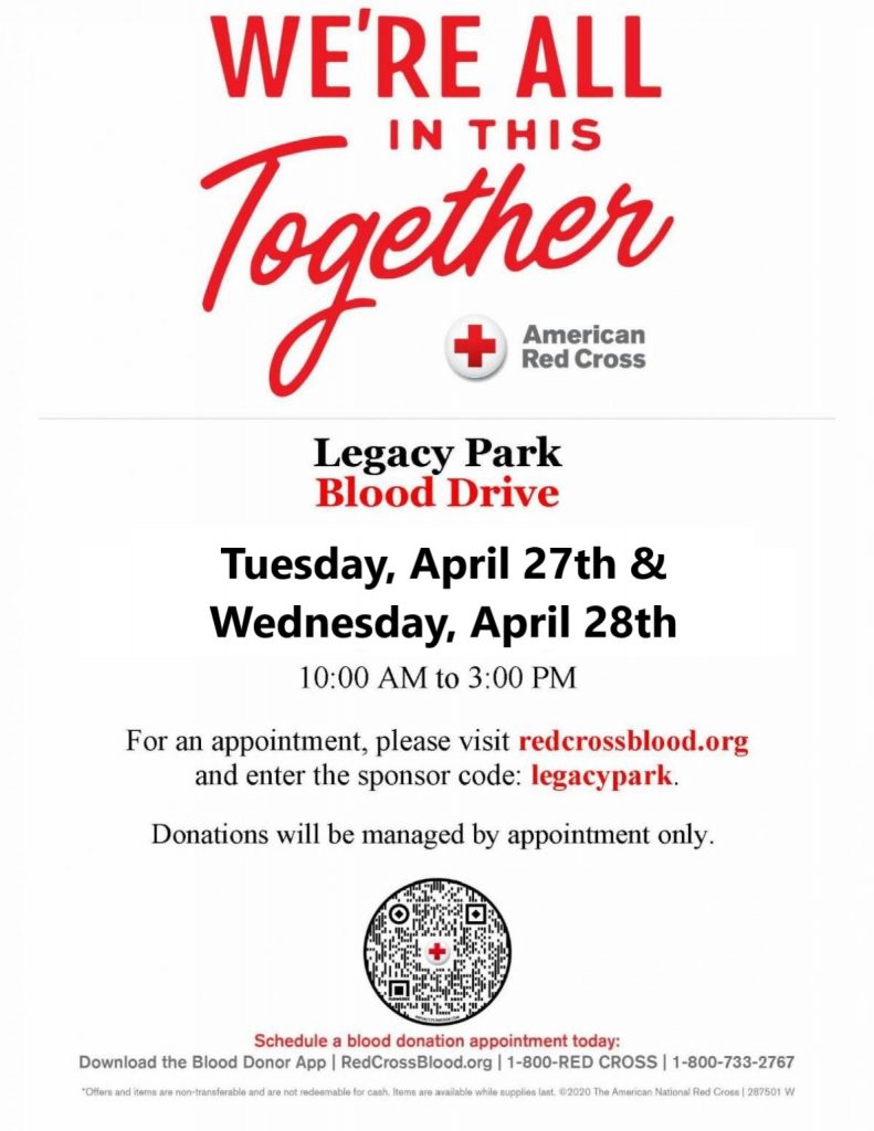 We will be hosting another Red Cross Blood Drive on April 27 & 28 from 10 am – 3 pm each day. Sign up early, the slots get filled quickly!
